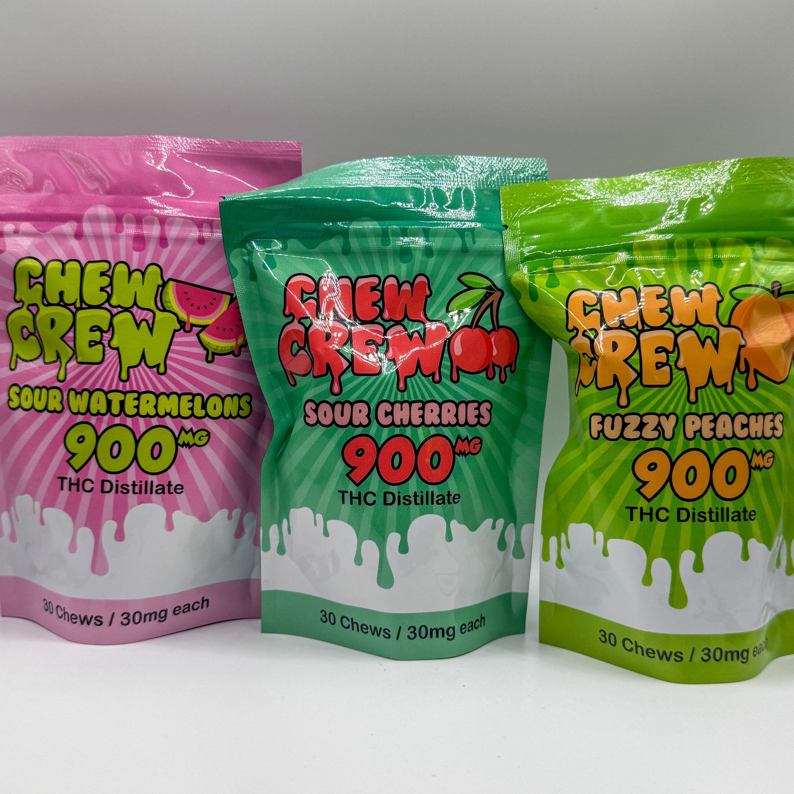 Enjoy the juicy, refreshing taste of Chew Crew’s 900mg packs Available in Fuzzy Peaches, Watermelons and Sour Cherries! Each pack contains 30 gummies, each infused with 30mg of THC, for a total of 900mg per package. Made with premium indica distillate, these gummies deliver a smooth, relaxing high, perfect for unwinding after a long day. From Chew Crew, a trusted Canadian brand, these gummies offer consistent potency and delicious flavor in every bite.